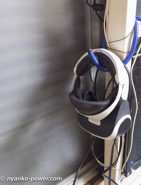 完成しました。私の場合テレビはゲーム用としてディスプレイとしてしか使っていないので、棚の横にVRやコントローラーをぶら下げるようにし、机の上にこれらのものが散らからないようにしました。